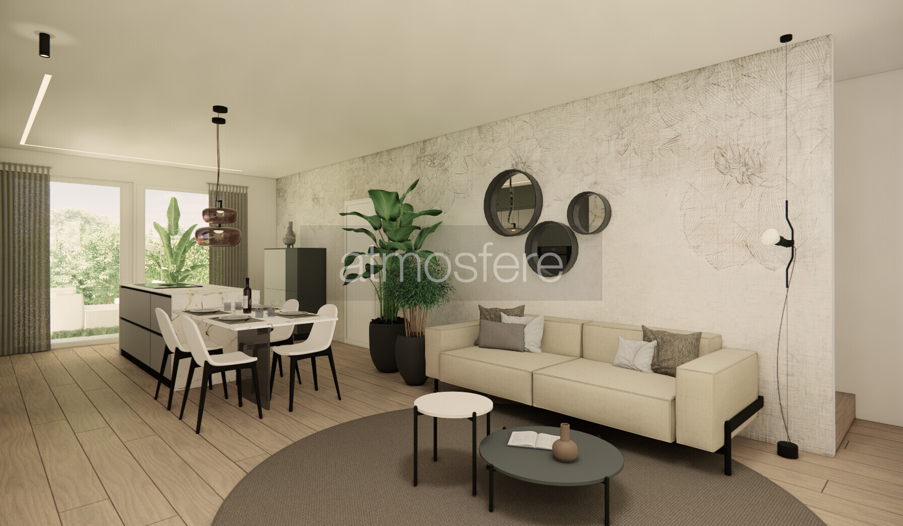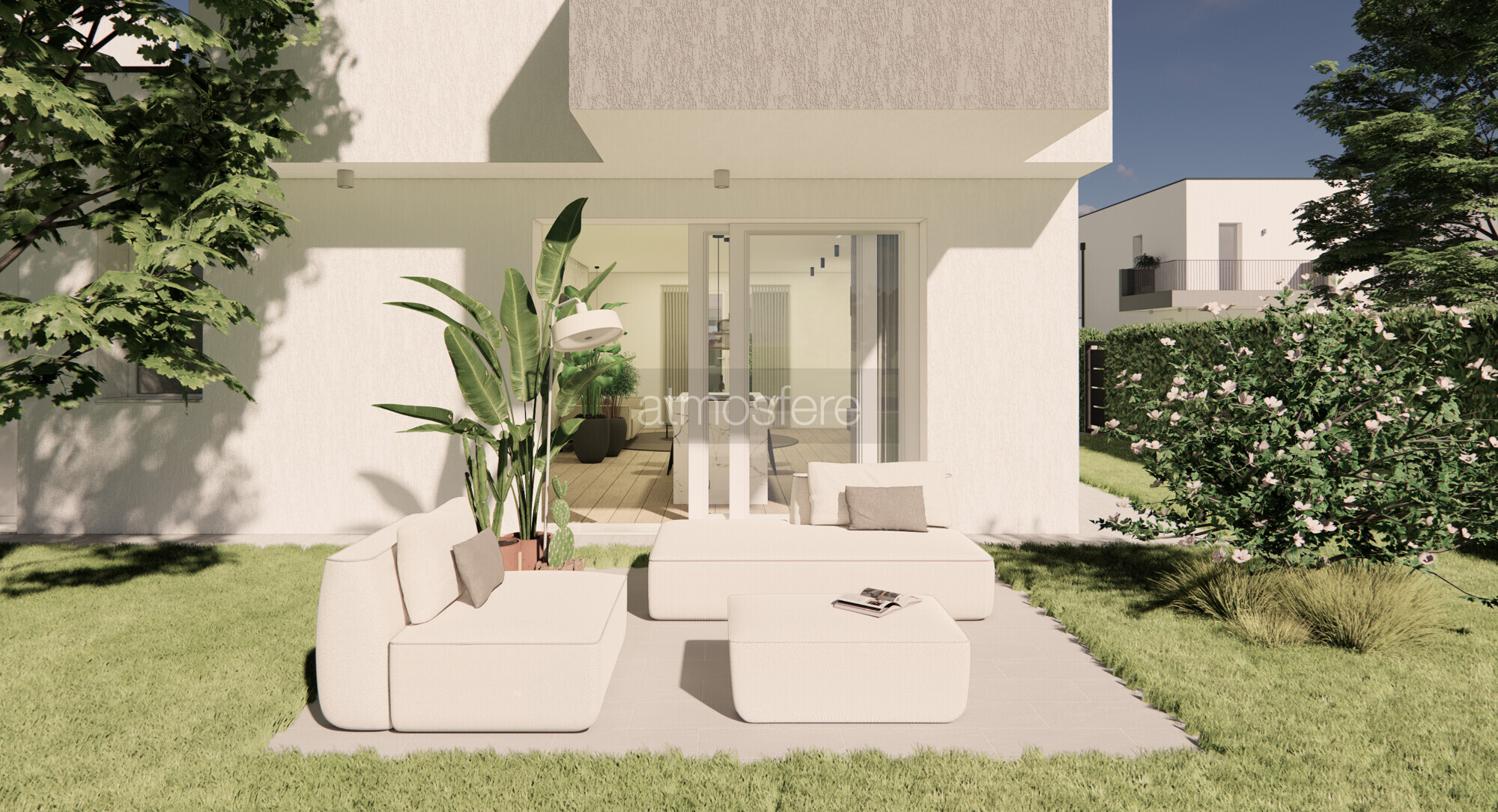 Zona Giorno Open Space: Un ampio soggiorno di oltre 40 mq, con cucina a vista e vetrate panoramiche che si aprono su un ampio patio esterno pavimentato, perfetto per cene all’aperto e momenti di relax in totale privacy.