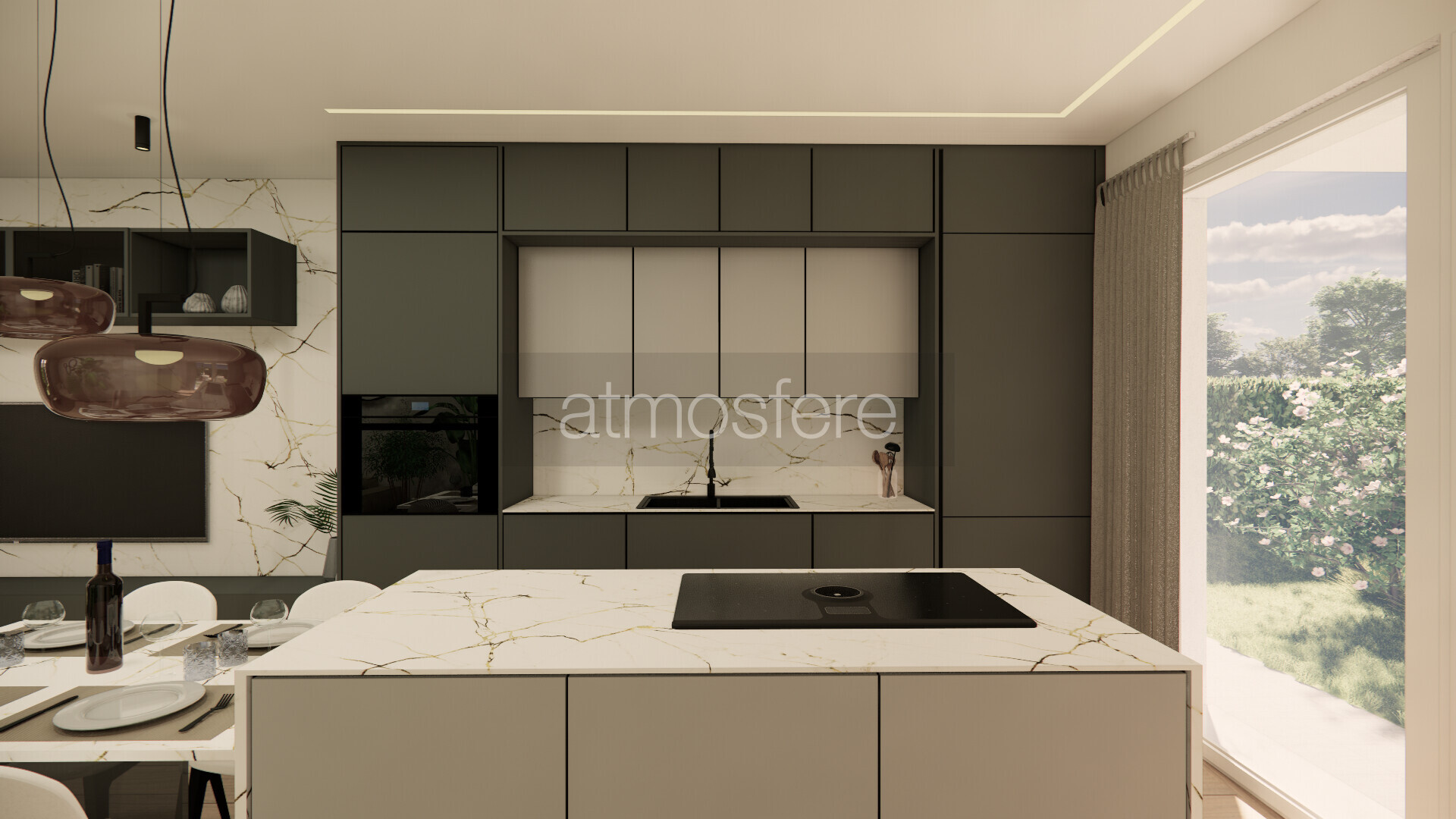 Zona Giorno Open Space: Un ampio soggiorno di oltre 40 mq, con cucina a vista e vetrate panoramiche che si aprono su un ampio patio esterno pavimentato, perfetto per cene all’aperto e momenti di relax in totale privacy.