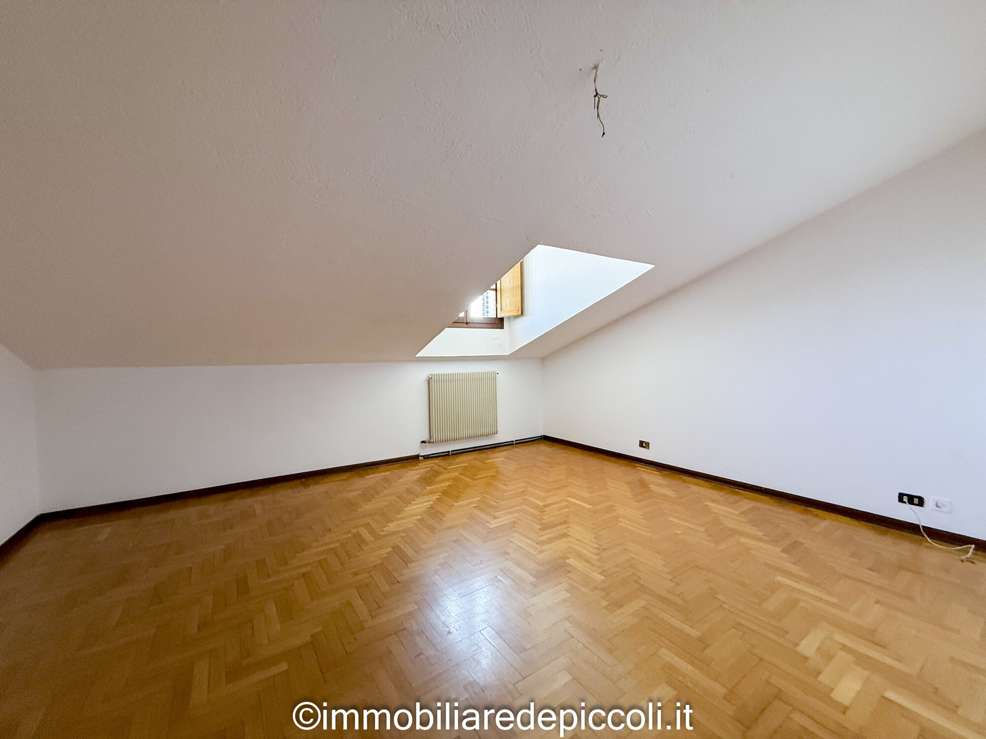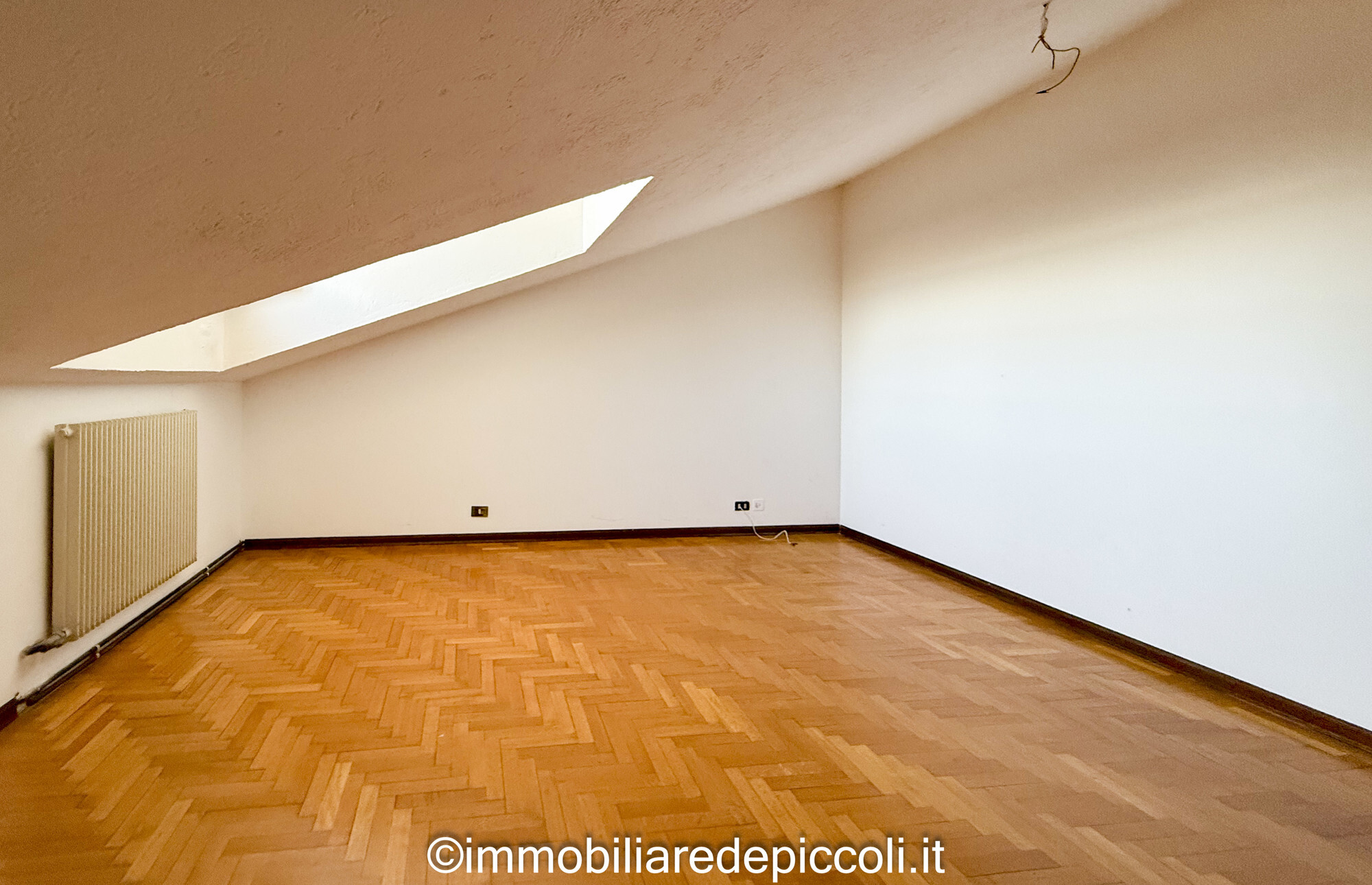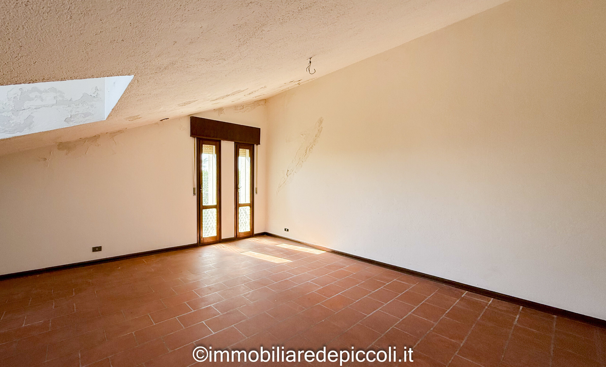 L’ingresso accompagna in un luminoso soggiorno, uno spazio accogliente e ben distribuito, ideale per vivere momenti di relax o convivialità. La cucina abitabile, sviluppata nel sottotetto, colpisce per le sue dimensioni generose e per le potenzialità di personalizzazione. La zona notte è composta da due camere da letto di comoda metratura e un bagno.