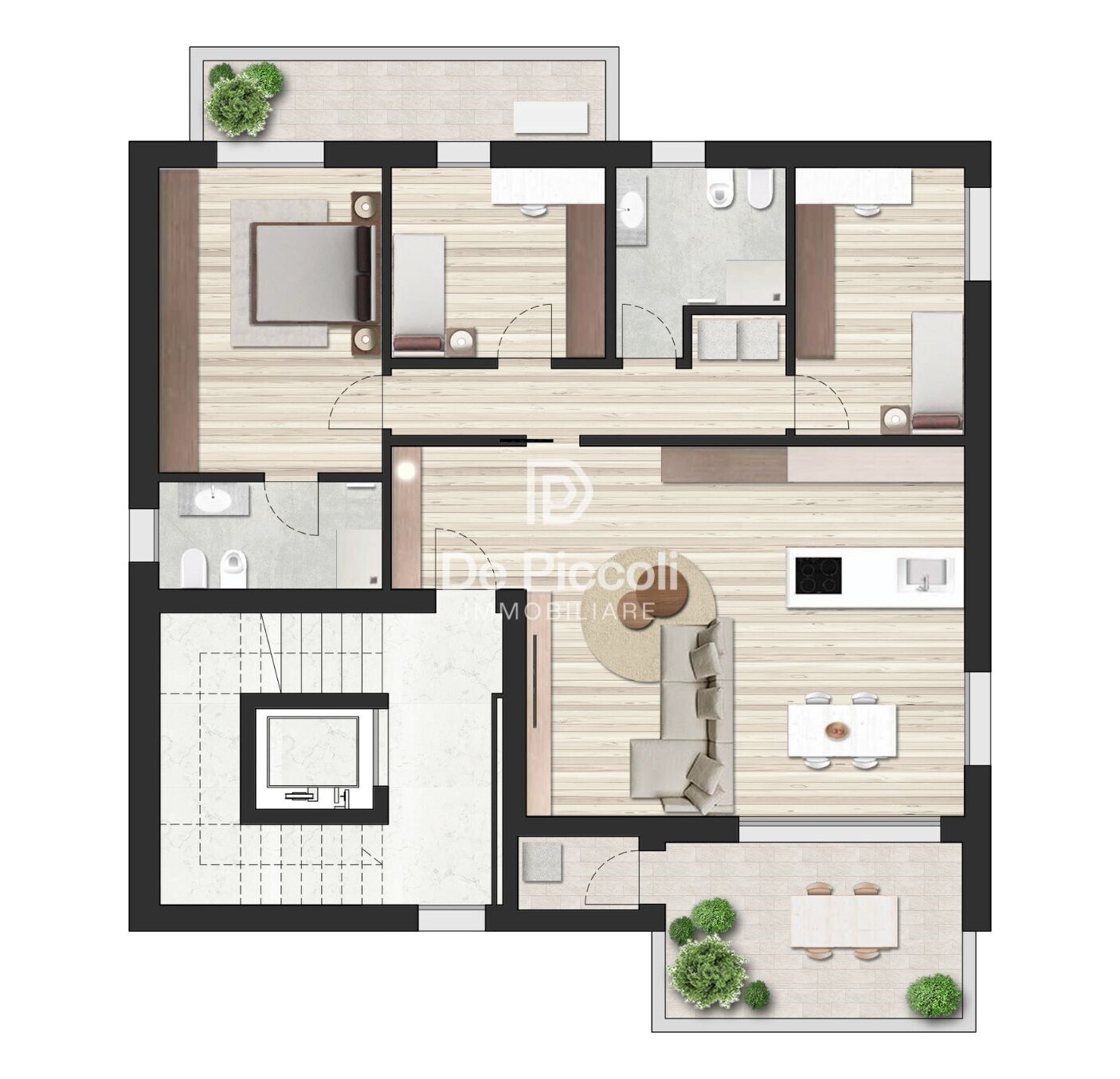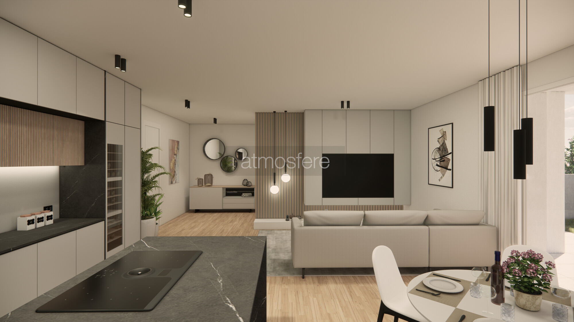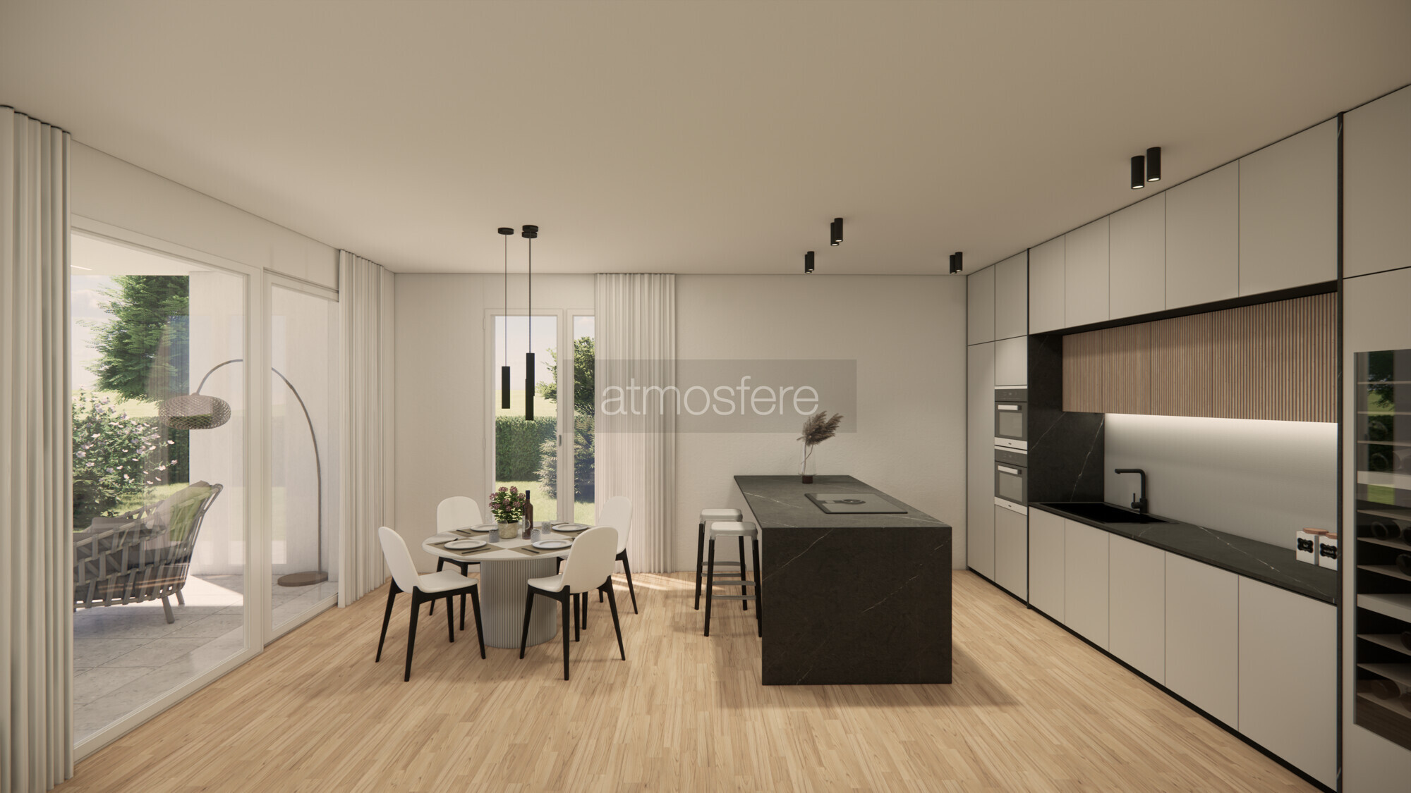 Ogni appartamento dispone di un'ampia zona giorno di oltre 40 mq, con cucina a vista dove una grande vetrata permette una luminosità naturale ottimale e si apre su una comoda loggia coperta, perfetta per momenti di relax all'aperto.