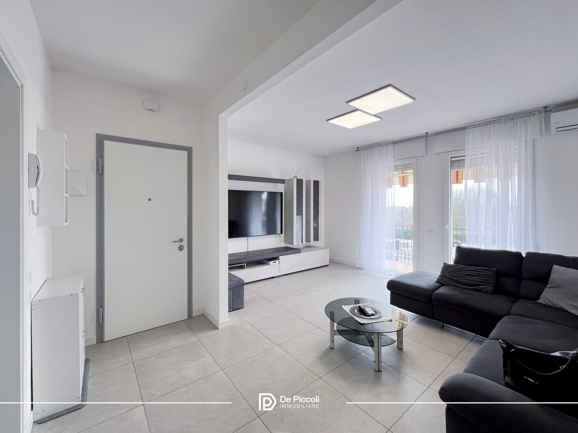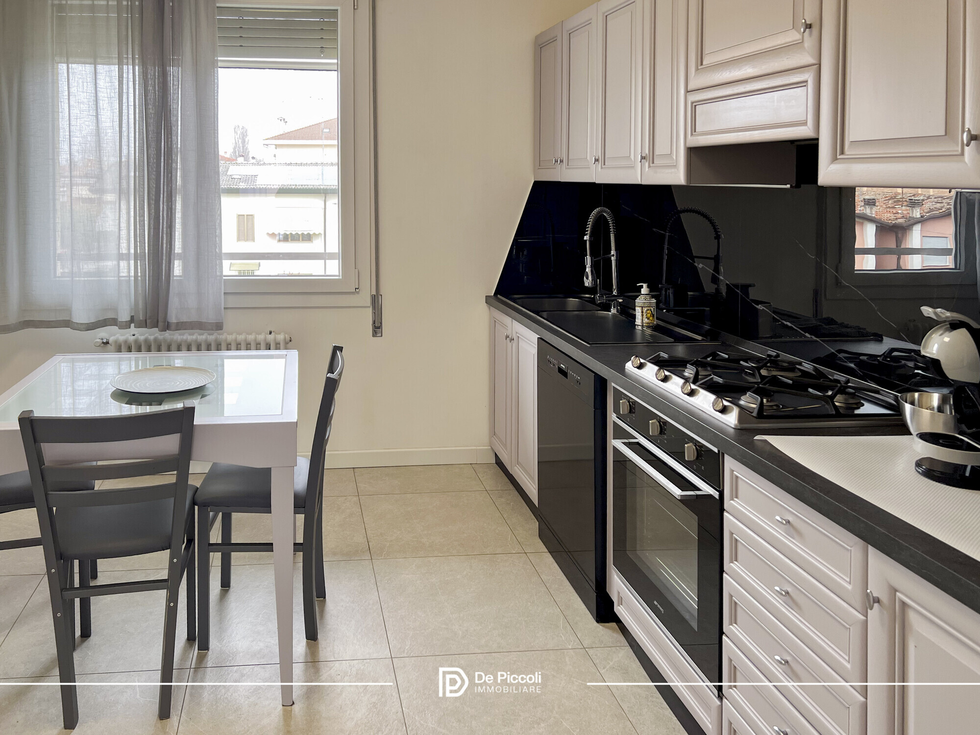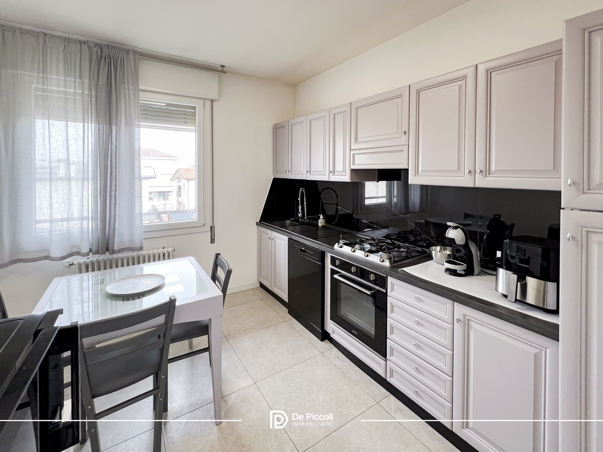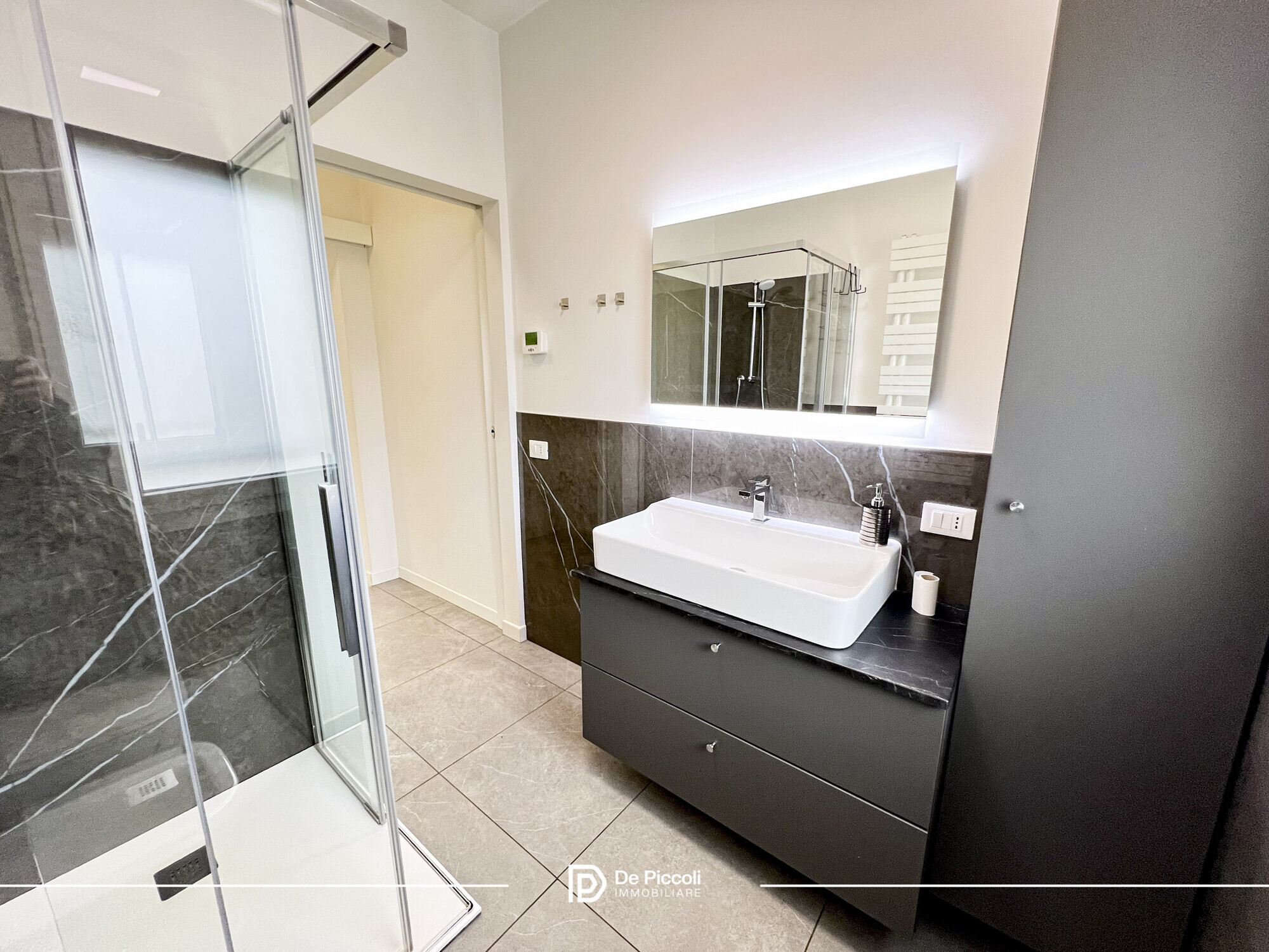 Le finiture in gres conferiscono eleganza e praticità, mentre l’ottima esposizione regala luce naturale durante tutto l’arco della giornata, creando un’atmosfera calda e accogliente.