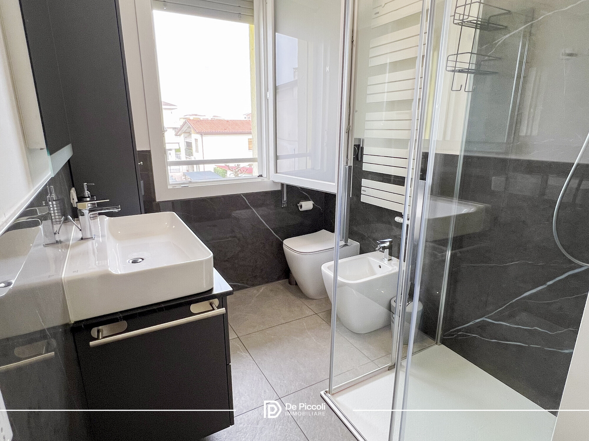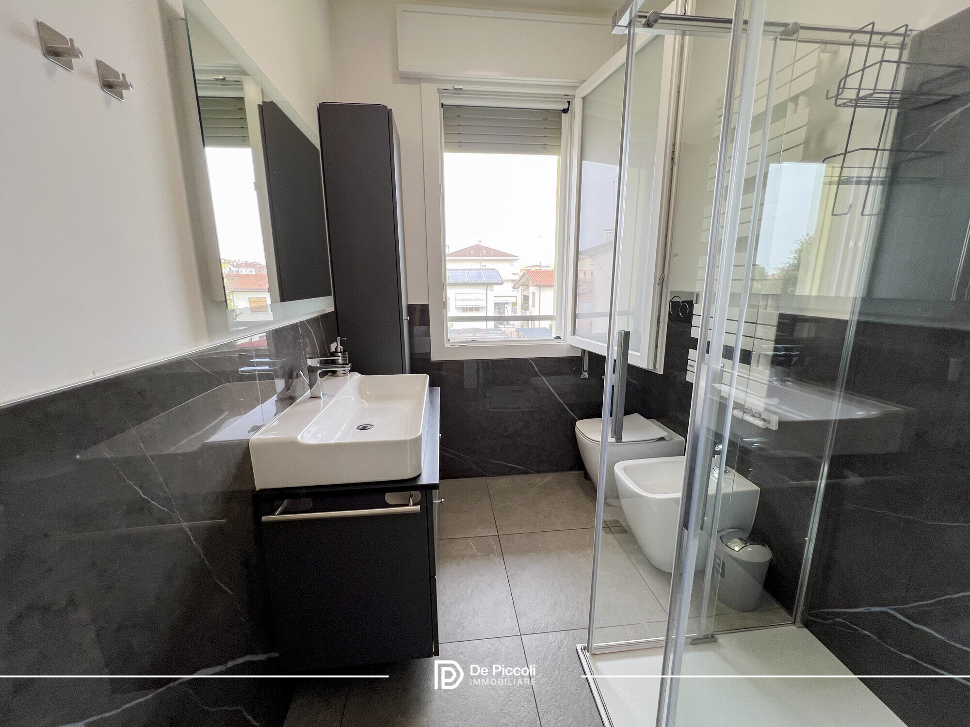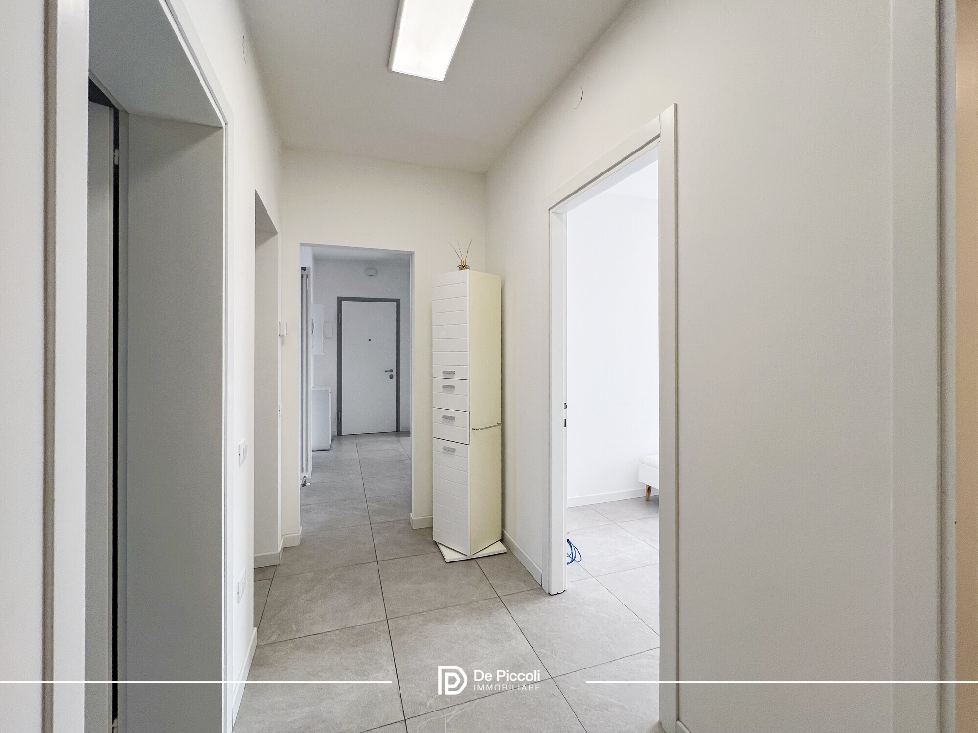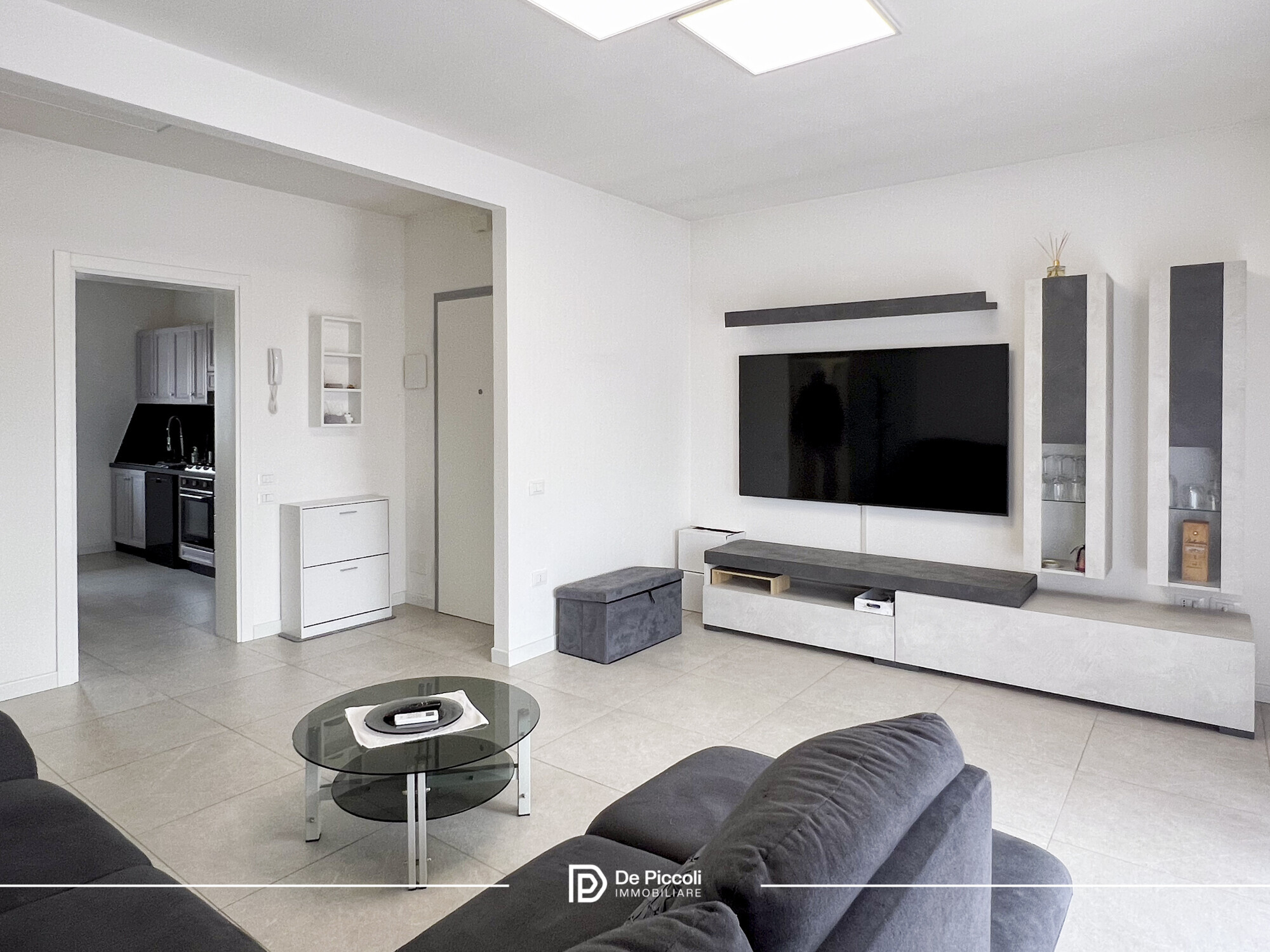 Le finiture in gres conferiscono eleganza e praticità, mentre l’ottima esposizione regala luce naturale durante tutto l’arco della giornata, creando un’atmosfera calda e accogliente.