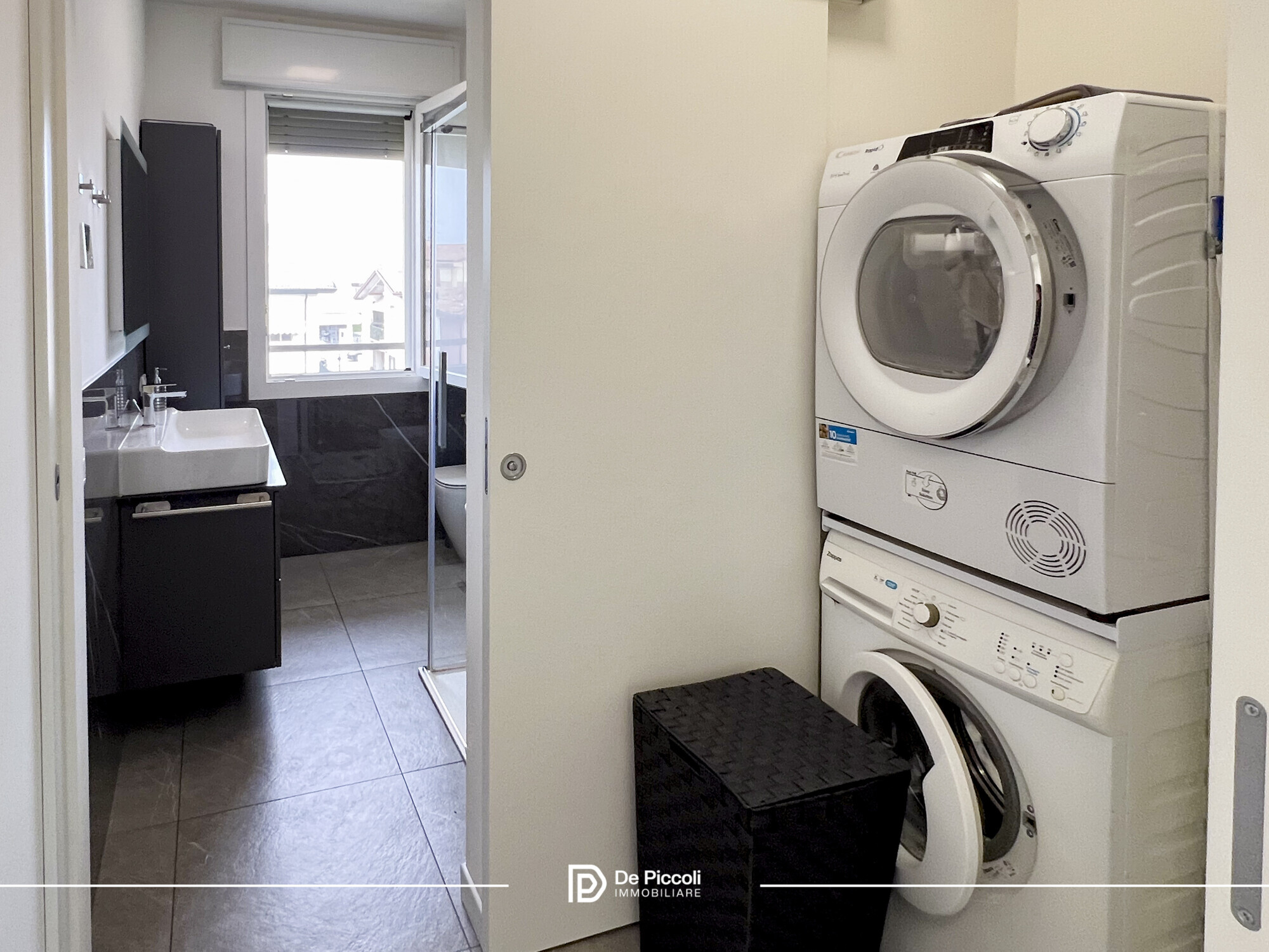 Il bagno, affiancato da un pratico antibagno oggi adibito a lavanderia, completa una disposizione interna pensata per essere concreta e funzionale, senza rinunciare all’armonia degli spazi.